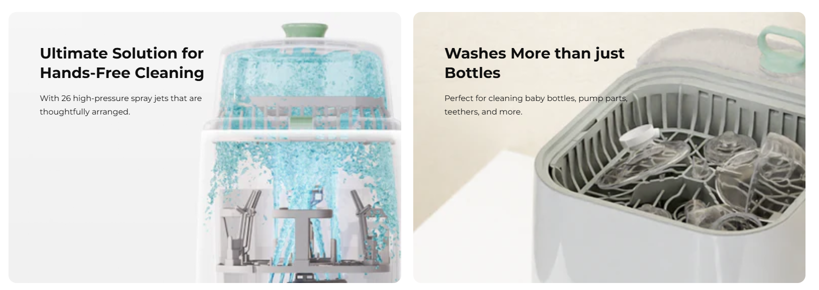In addition to baby bottles, the Momcozy washer can safely clean other baby items such as breast pump parts, nipples, pacifiers, teething toys, and baby toys.
