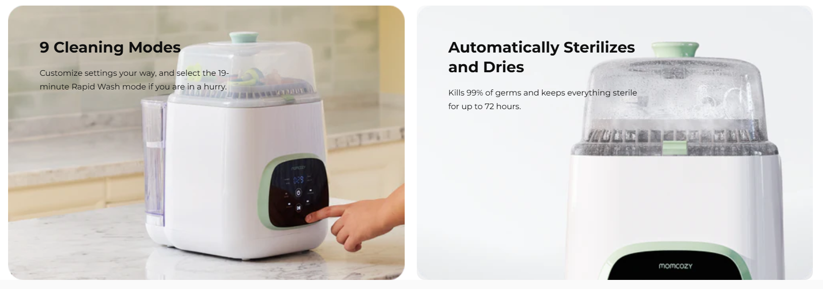 These 9 modes make the Momcozy KleanPal Pro a versatile and advanced cleaning solution, surpassing most standard bottle washers by offering tailored options for different cleaning needs.
